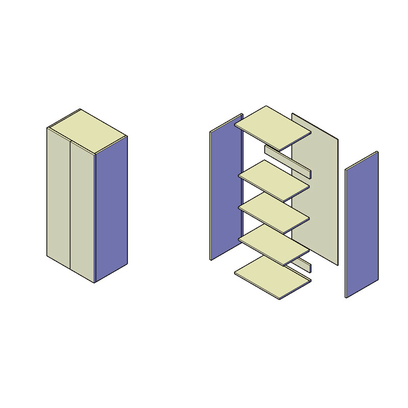 A lapos konyhai kamra két oldallapból, egy hátsó panelből, egy fix polcból, 4 lebegő polcból, két töltőanyagból áll. Minden panelt előfúrtak, a vevőnek csak össze kell őket szerelnie.