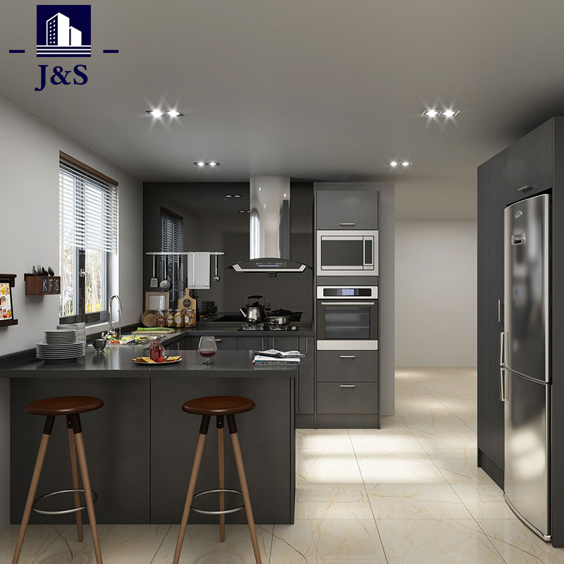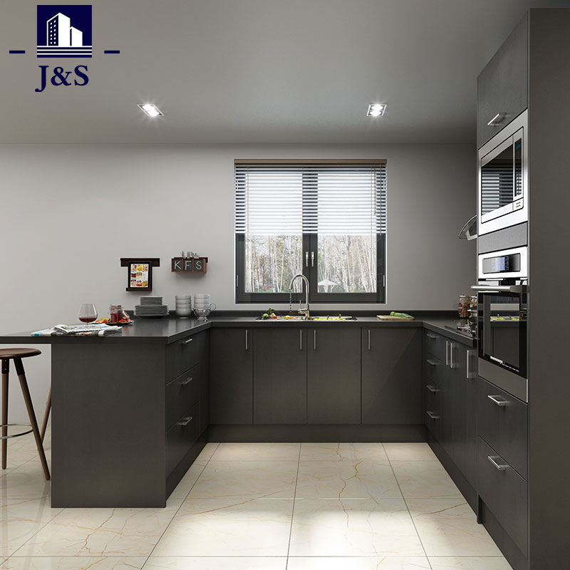 Modern fekete lakk konyhai szekrényeket szállítunk, ez egy fogantyú nélküli konyhai kialakítás PE&PU lakk bevonattal, amely kiválóan teljesít a víz- és karcállóságban.