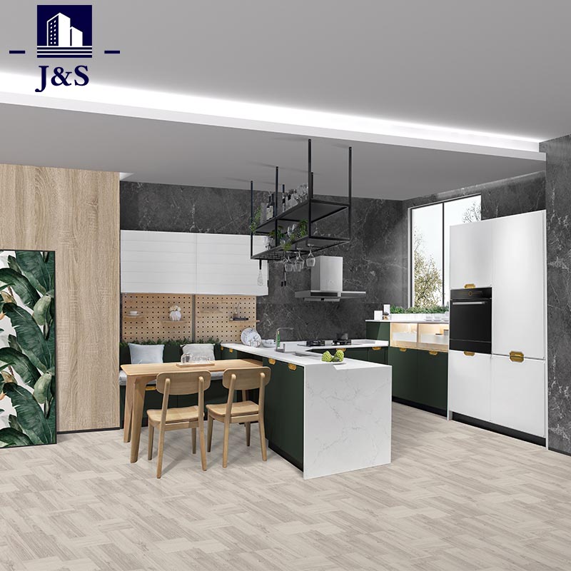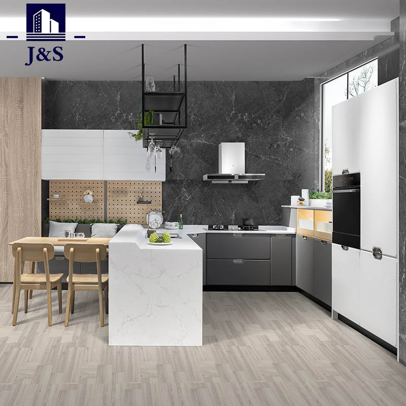 J&S kínálat Új dizájn matt fehér konyhaszekrény, akril bevonatú ajtós konyhaszekrény. Az akril ajtólapokat a jó átlátszóság érdekében használják, mert az ilyen ajtólapok színtelen és átlátszó plexi lemezekből készülnek, fényáteresztő képessége pedig elérheti a 92-t is. %, tükörhatást érve el, és vizuálisan bővíti a konyha terét.